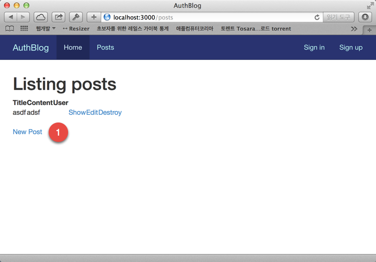 로그인 후에는 1번 위치에 로그인된 사용자의 이메일 주소가 나타난다. 데이터를 입력하고 Create Post 링크 버튼(2번)을 클릭하면 데이터가 저장된 후 show 액션으로 리디렉트된다.